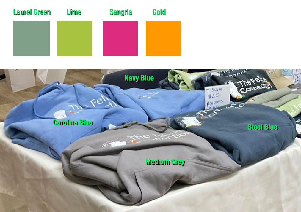 T-shirts, Hoodies, and Winter Pom Pom Hats are now available for pre-order! You choose the color and size. Silkscreened locally at Mitchell’s Tees and Print in Pittsford, VT. These high-quality items make great gifts and support our cats and kittens at the same time! Orders will be available for pick-up in Rutland, VT. Other locations by arrangement. Payment at pickup.